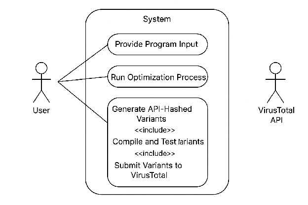 Use Cases → Provide Input Program, Generate API-Hashed Variant, Compile and Test Variants, Submit Variants to VirusTotal, Receive VT Result.