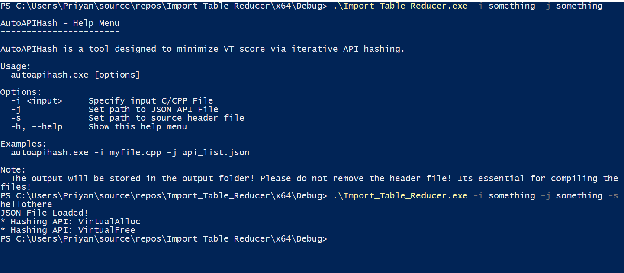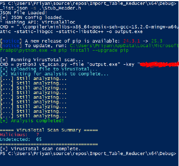 Introduction: This is a sub-component of the APT simulation tool, this part is responsible for minimizing VT score via the usage of API Hashing to remove different APIs present in the import table of the PE. The goal is to automatically hash APIs from a given list, compile it and test it against VT.
